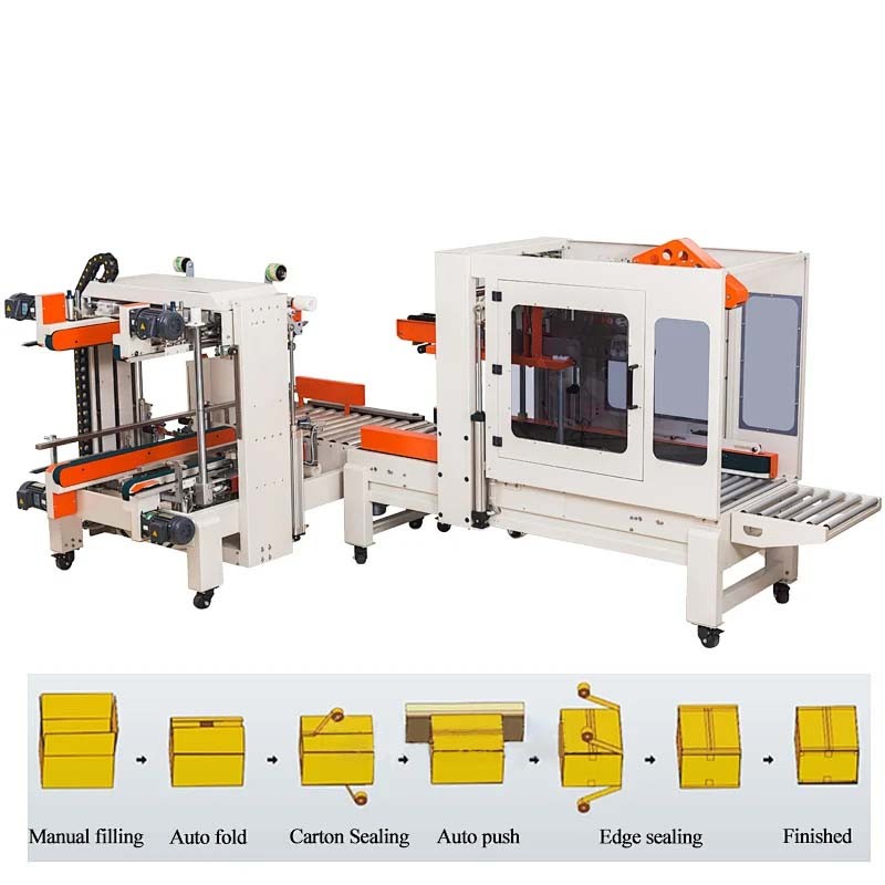 DQFXS7050 four-corner edge sealing automatic carton sealing machine and DQFXZ5050S automatic folding and lid sealing machine form an I-shaped carton sealing line, which can meet the needs of products that need to be reinforced on all sides of the carton, and complete the sealing on all sides and the middle once. DQ series box sealing machine can automatically sense the size of the box without manual adjustment. When the same specification is needed to seal the box, it only needs to lock the induction function to seal the boxes in batches. The machine is widely used in electrical, household, textile, food, daily necessities, medicine, chemical and other industries.